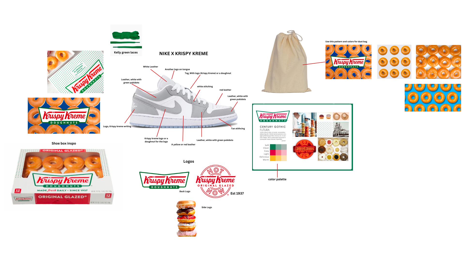 In SNKR 375, I was tasked with selecting a brand and designing a custom pair of Jordan 1 sneakers. I chose Krispy Kreme as my inspiration, combining the iconic elements of the brand with the distinct design language of the Jordan 1. In addition to crafting the sneakers themselves, I also designed the packaging, ensuring that every aspect of the product from the footwear to the unboxing experience reflected the playful nature of Krispy Kreme’s brand.