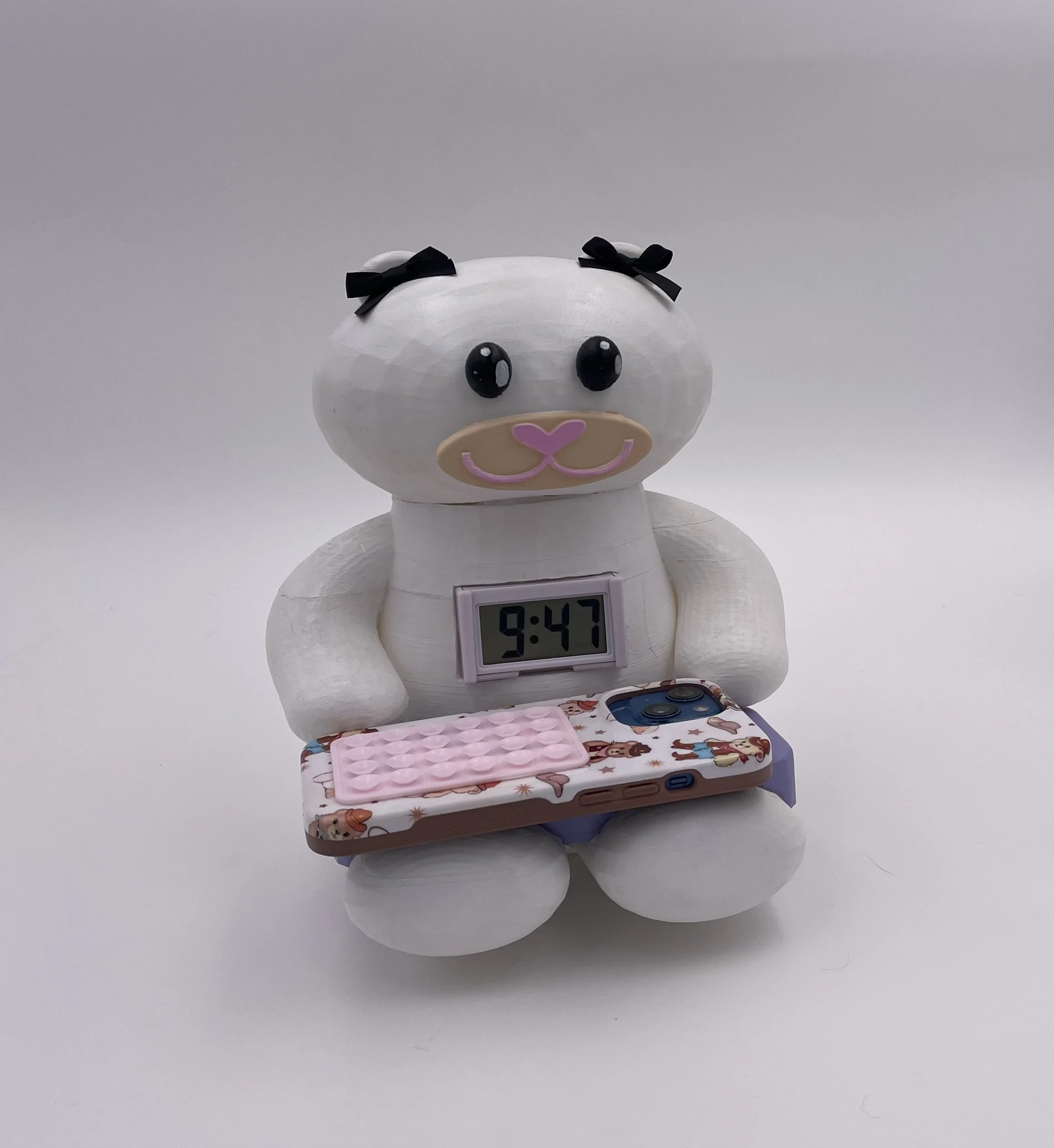 This lamp was developed as part of my Product Form class, where we explored the significance of form in product design. For the project, we were tasked with selecting an emotion as a design inspiration, and I chose happiness. Drawing from this theme, I crafted a playful and endearing bear concept, blending elements of charm and whimsy. The lamp was fully modeled in Rhino7 and 3D printed for precise fabrication. It features a wireless charging pad integrated into the bear's base and a light embedded in the top, seamlessly combining functionality with a joyful design.